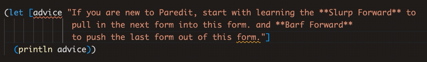 Calva Paredit helps you navigate, select and edit Clojure code in a structural way. LISP isn't line or character oriented, it is based around S-expressions, a.k.a forms. We strongly recommend that you take advantage of the structural nature of Clojure, and have therefore put a lot of work into making Calva Paredit extra awesome.